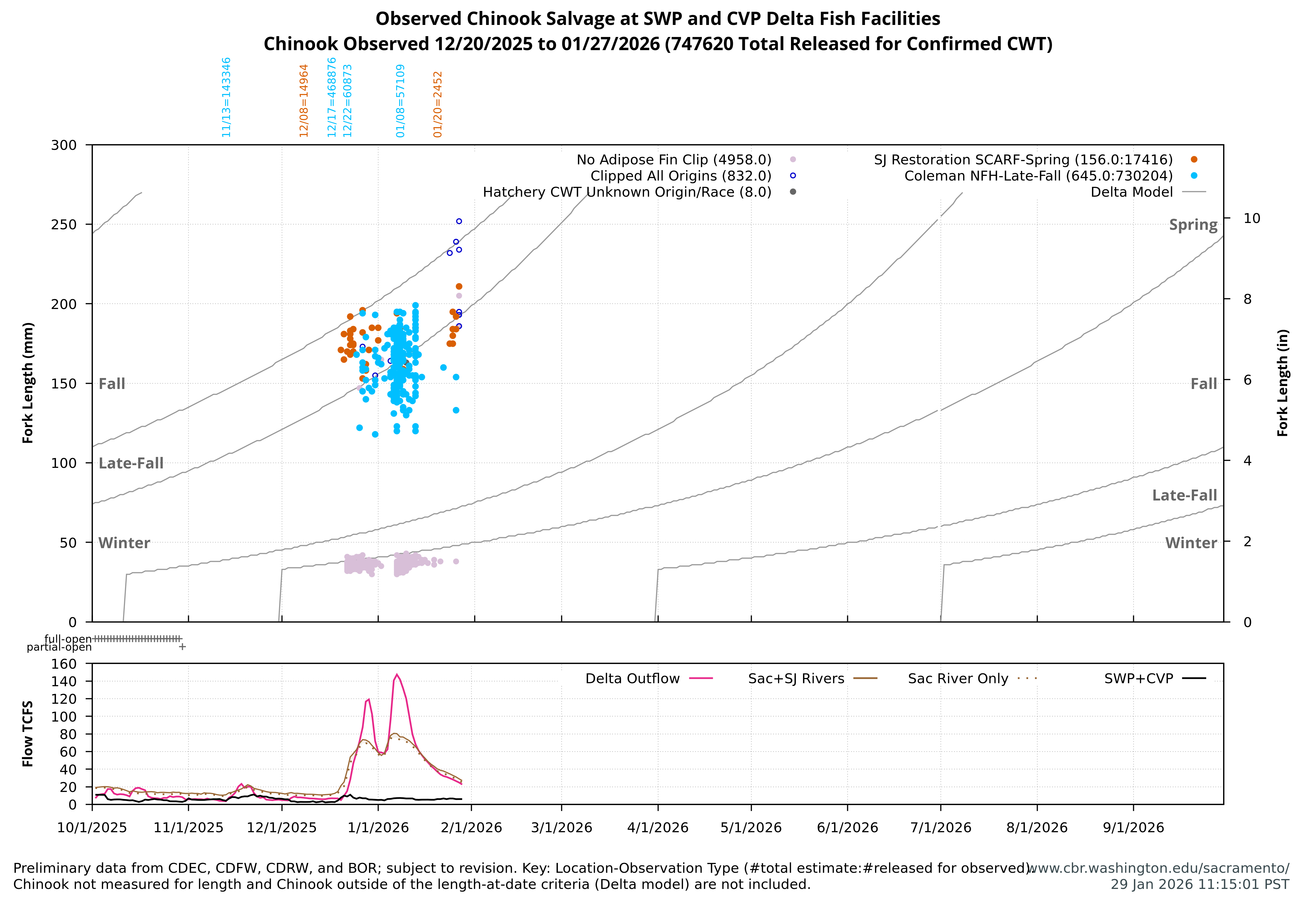 Observed Chinook Salvage at SWP and CVP Delta Fish Facilities, Chinook Observed 12/20/2025 to 01/27/2026 (747620 Total Released for Confirmed CWT) with Delta and River Flow